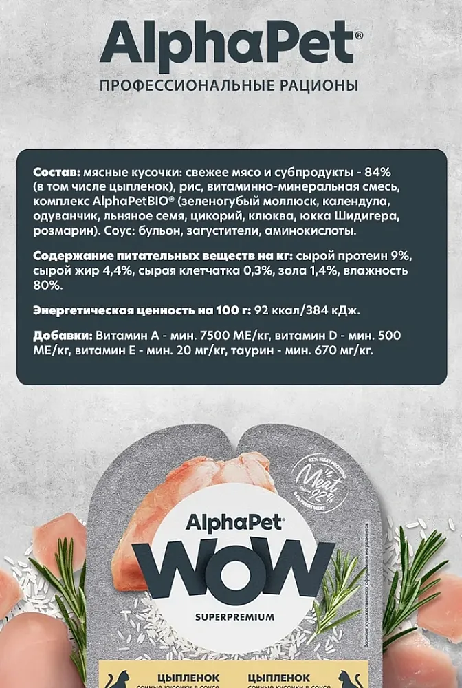 AlphaPet WOW Superpremium Цыпленок сочные кусочки в соусе для взрослых кошек – влажный полнорационный корм для взрослых кошек.