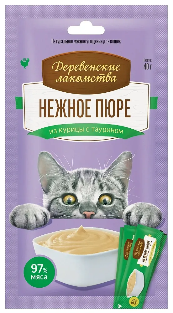 "Деревенские лакомства" Нежное пюре из курицы - это мясной десерт для кошек.
