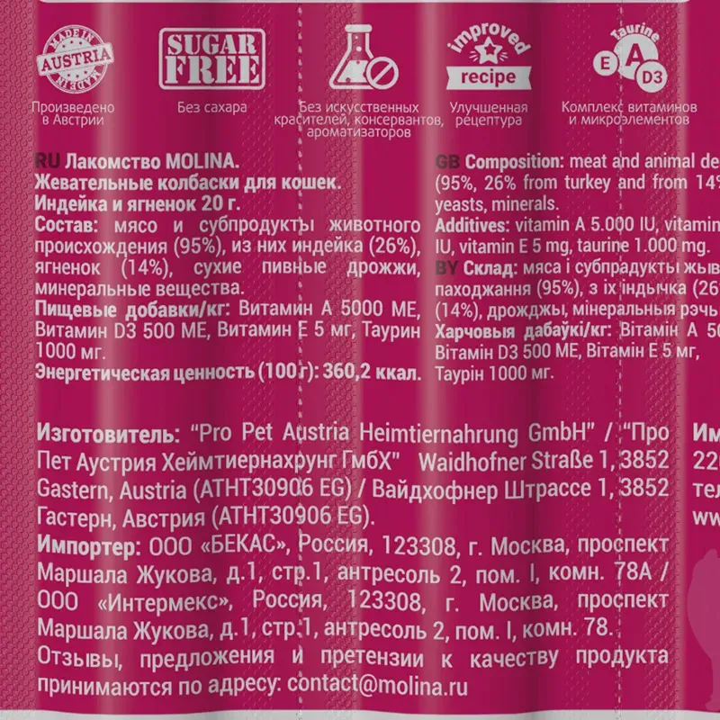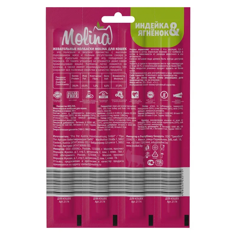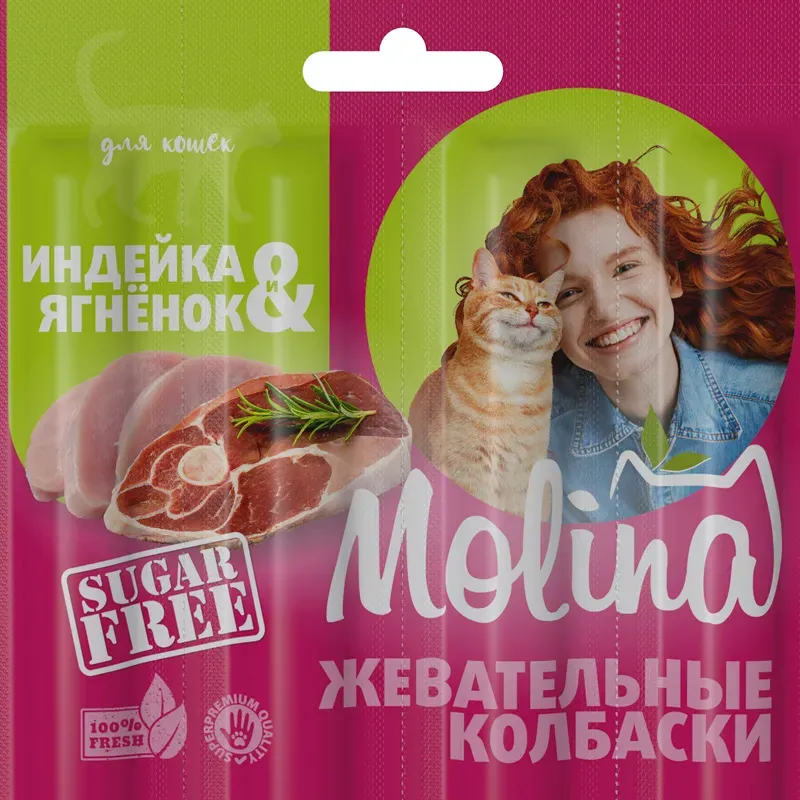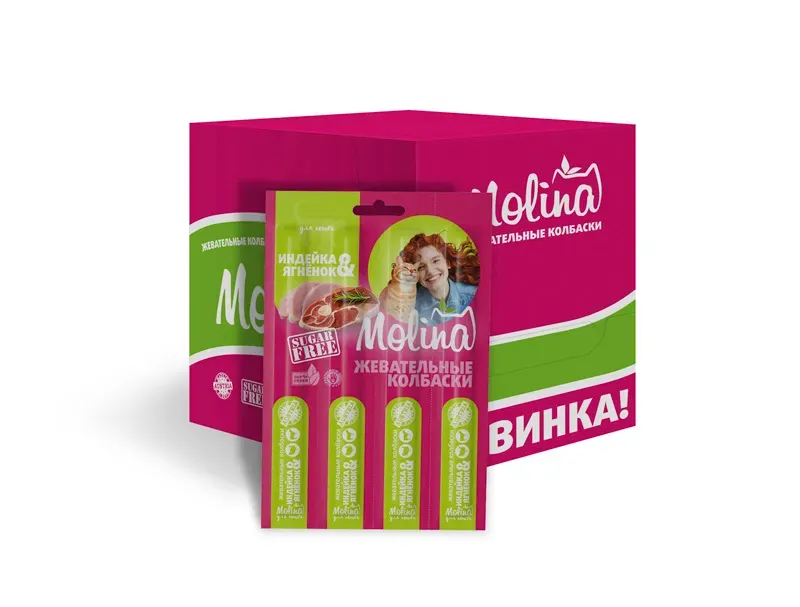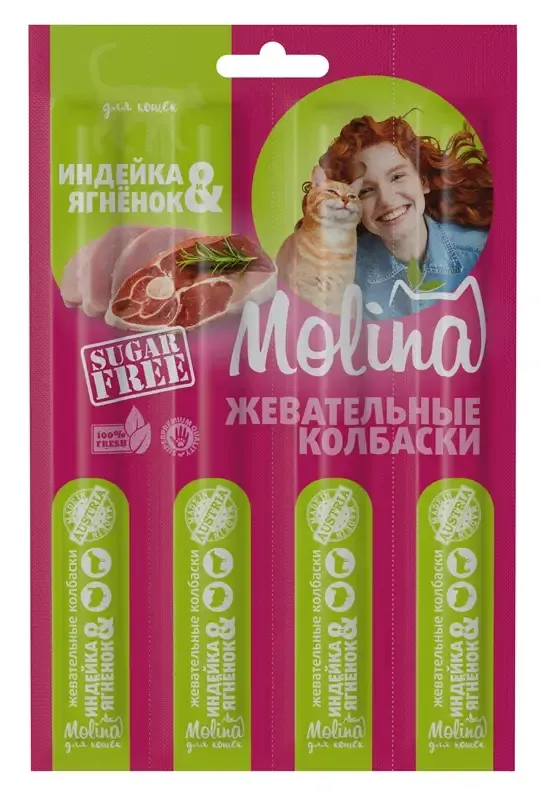 Molina Жевательные колбаски для кошек Индейка и ягненок – лакомство класса Holistic. 95% цельного натурального мяса, из них индейка 26%, ягненок 14% .